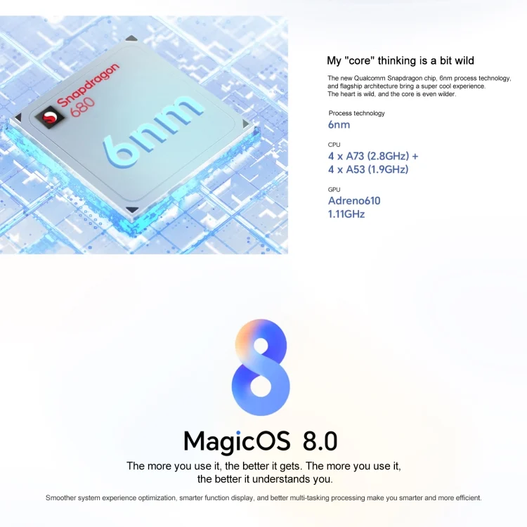 4. CPU: Qualcomm Snapdragon 680 Octa Core (4 x Cortex-A73 2.4GHz + 4 x Cortex-A53 1.9GHz)