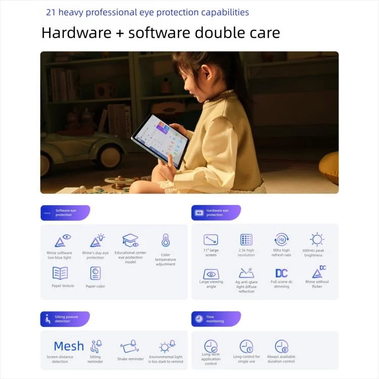 3. Display: 11 inch 2.5K LCD screen, 2560×1600 resolution, 274 PPI, up to 600nits brightness, up to 90Hz refresh rate, up to 360Hz finger touch sampling rate, 240Hz stylus touch sampling rate, support Rheinland hardware low blue light, no flicker, rhythm friendly certification. Soft Light Edition: Adopt ultra-clear soft light screen, with AG anti-glare technology, reduce interference light, reduce screen reflection, professional eye protection