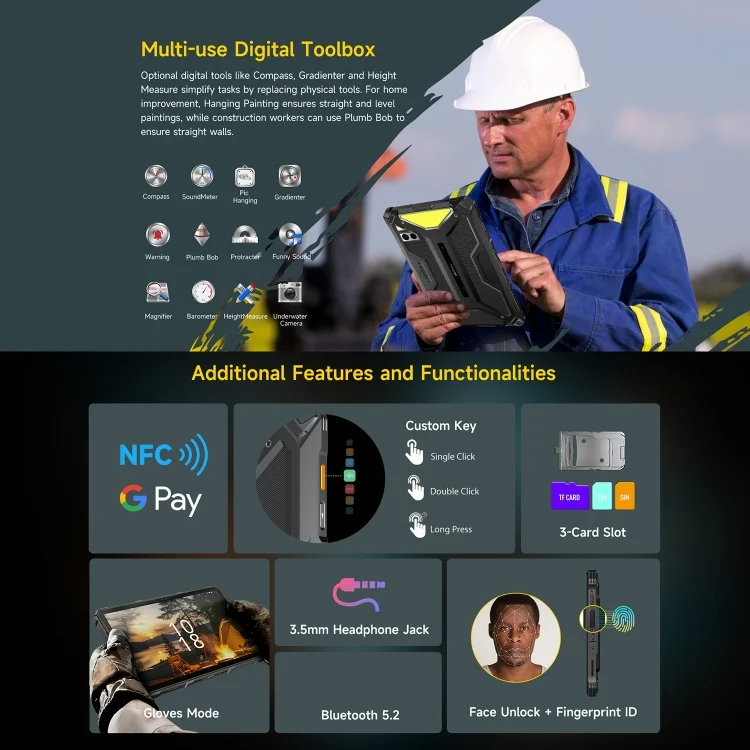 13. Features: Face unlock, Side-mounted fingerprint ID, Camping Light, Compass, GPS positioning, Underwater camera, etc