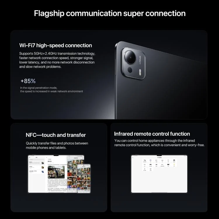 13. WI-FI: WiFi 7 protocol, 802.11 a/b/g/n/ac/ax, 2.4GHz&5GHz dual band, supports 2×2 MIMO, Wi-Fi Direct, Miracast