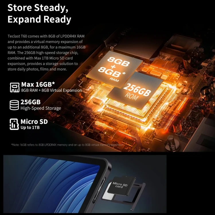 3. Max Speed at Your Fingertips: T60 is powered by the UNISOC Tiger T616 chipset, complemented by up to 16GB RAM (8GB with an additional 8GB RAM Expansion) and 256GB internal storage, expandable to 1TB with a Micro SD card.