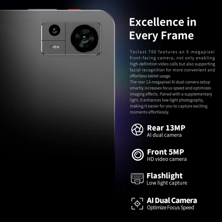 5. Max Capture Precision: Featuring a 13MP rear autofocus camera and a 5MP front shooter, the T60 ensures clarity for both captured memories and video conversations.