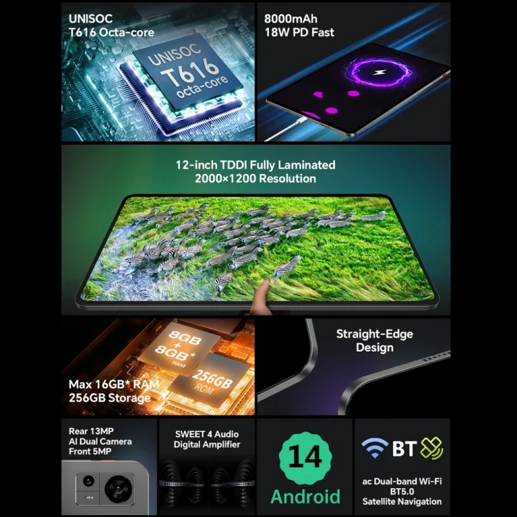 Teclast T60 4G LTE Tablet PC 12 inch, Android 14 Unisoc T616 Octa Core, Support Dual SIM