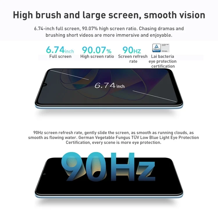 3. 6.74 inch 1600 x 720 TFT LCD IPS full screen, wide field of vision, small body.