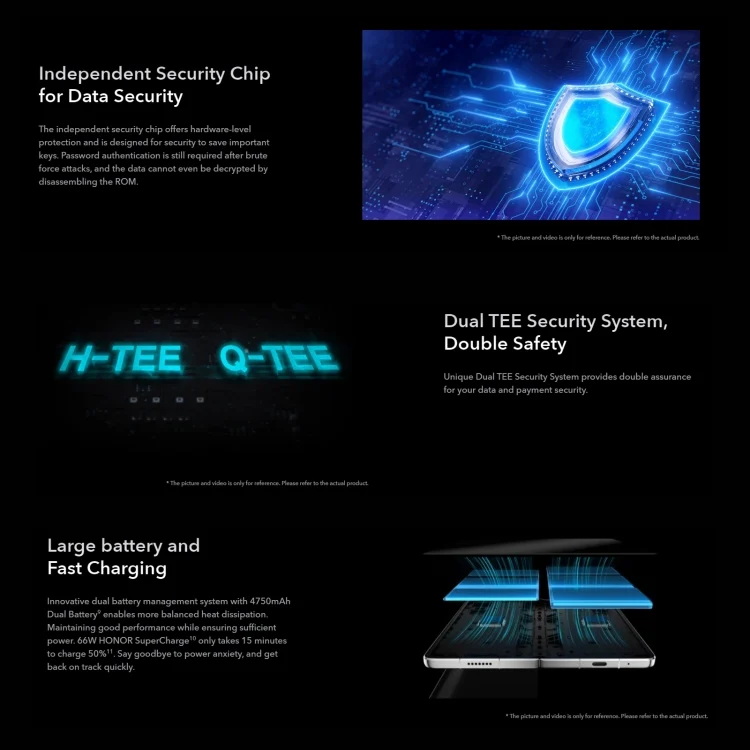 4. Equipped with 4 cameras: 3 rear cameras and 1 front in-screen cameras, take high quality pictures and excellent selfie. Rear cameras: 50 million pixel wide-angle camera (f/1.9 aperture) + 50 million pixel spectral enhancement camera (f/2.0 aperture) + 50 million pixel ultra-wide-angle camera (f/2.2 aperture); Front camera: 42 million pixel wide-angle camera (f/2.4 aperture) .