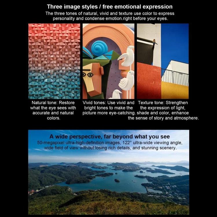 3. Camera Functions: Rear camera: Eagle eye capture, movie mode, multi-lens video, AI photography, high pixel mode, time-lapse photography, wide angle, large aperture, night scene mode, super macro, portrait mode (including skin beautification), professional mode, Slow motion, panorama, filter, watermark, smile capture, voice-activated photo, timed shooting, document scanning, micro movie; Front camera: Portrait mode, filter, smile capture, selfie mirror, voice-activated photo, timed shooting, gesture photo, Night scene mode, watermark mode, high pixel mode, multi-lens recording
