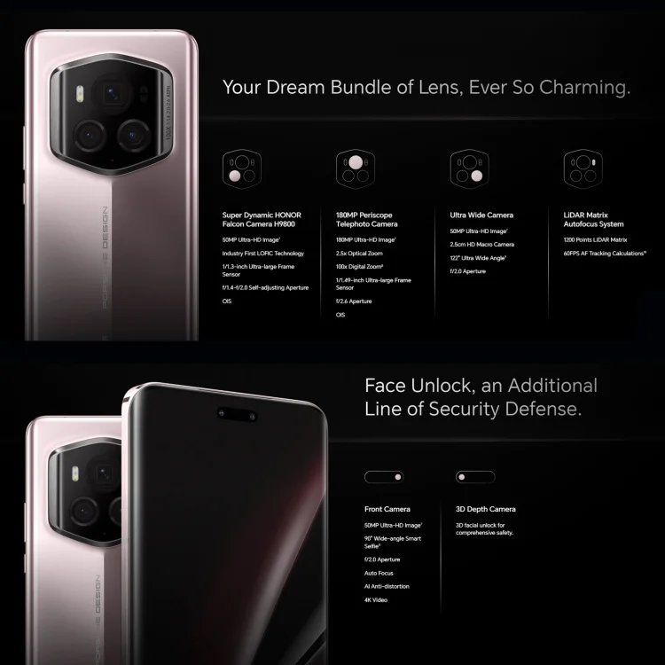 1. Dual Rear Camera: 50MP wide-angle camera (f/1.4-f/2.0 aperture, supports LOFIC technology, supports OIS optical image stabilization) + 180MP telephoto camera (f/2.6 aperture, supports OIS optical image stabilization) + 50MP ultra-wide-angle camera (f/2.0 aperture ) + LiDAR array focusing system, support AF