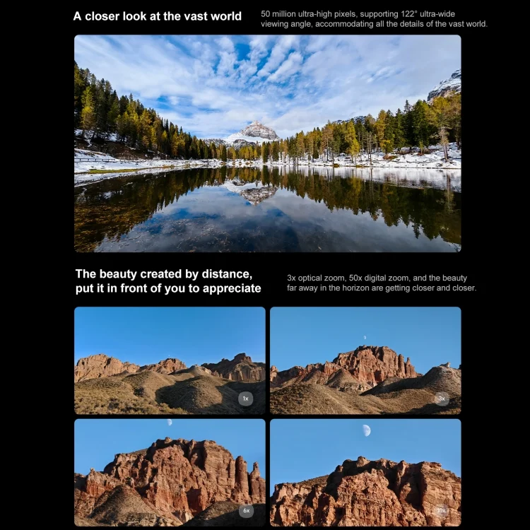 1. Rear Cameras: 50MP wide (f1.9, OIS, Focus Pixels, 4-in-1 2.4um large pixel output) + 50MP ultra-wide (f2.0, 122 FOV, Focus Pixels, 2.5cm macro) + 50MP telephoto (3x optical zoom, f2.4, OIS, 50x digital zoom)