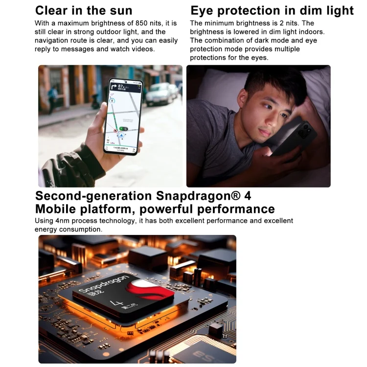 1. CPU: Qualcomm Snapdragon 4, octa-core, 2 x A78 2.2GHz + 6 x A55 1.95GHz