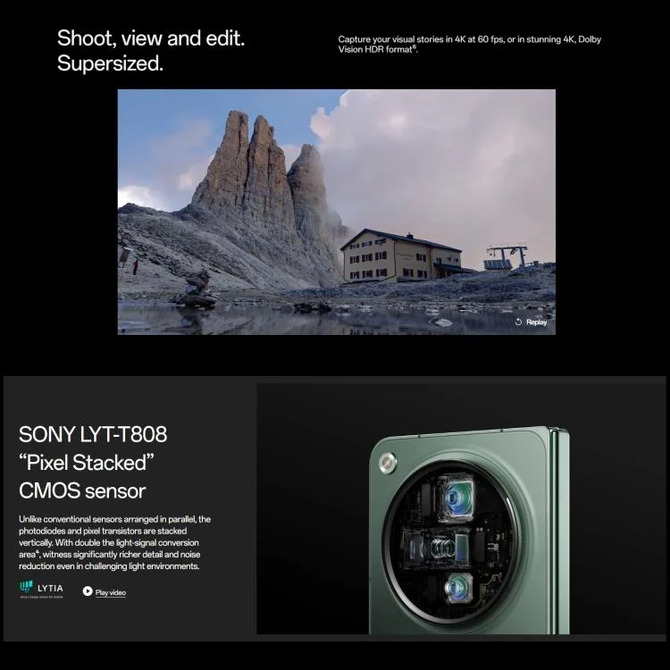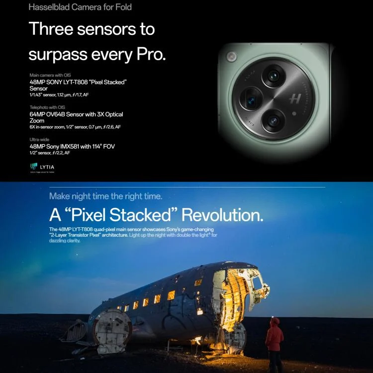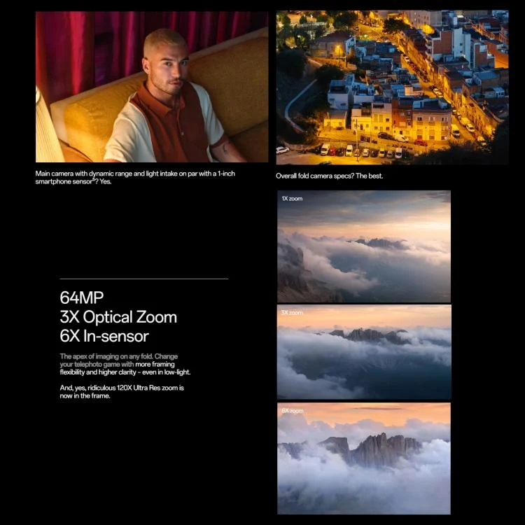 1. Rear camera: 48MP main (LYT-T808, f1.7) + 8MP wide (IMX581, f2.2, 114 degrees) + 64MP telephoto (OV64B with 3X optical zoom, 6X in-sensor zoom, f2.6)