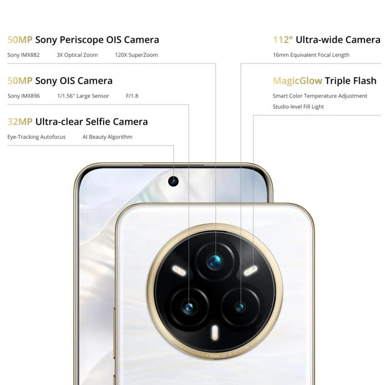 1. Rear: 50MP periscope telephoto (IMX882, f2.65) + 50MP main (IMX896, f1.8) + 8MP ultra-wide-angle (f2.2, 5P lens, 112 degrees)