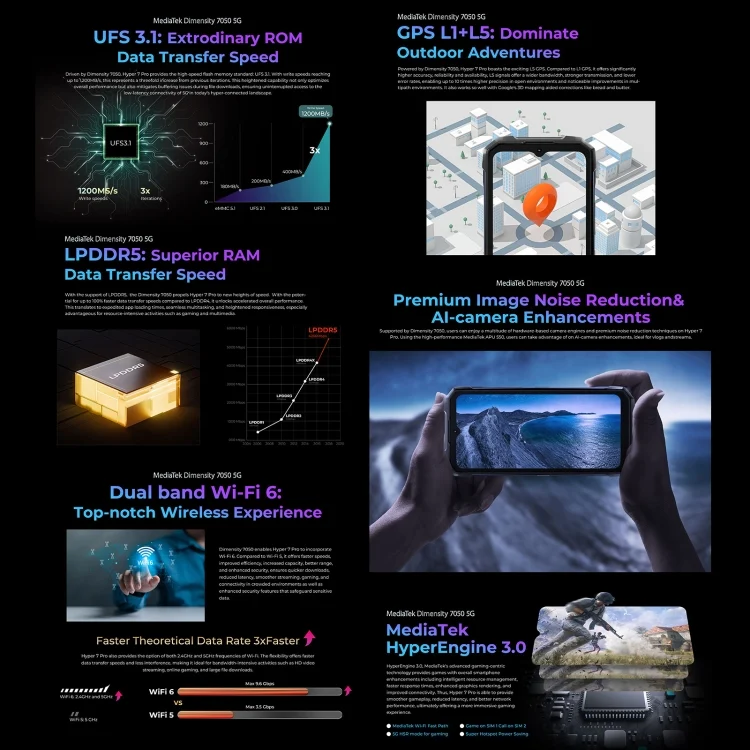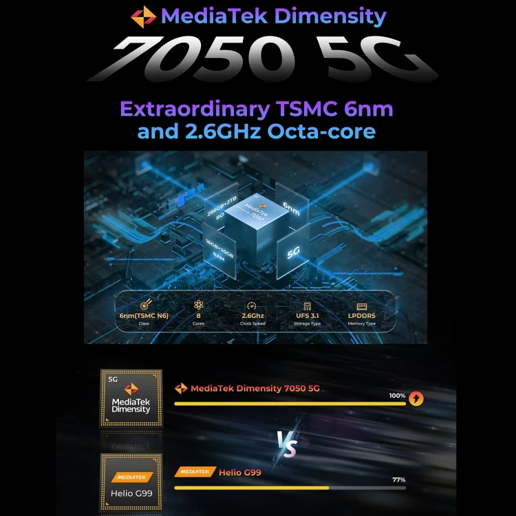 1. CPU: MediaTek Dimensity 7050, 6nm, 2x A78 2.6GHz +6x A55 2.0GHz