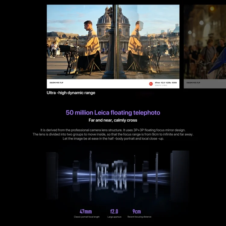 1. Rear: 50MP main camera (f/1.7 large aperture, 23mm equivalent focal length) + 50MP telephoto (OV60A image sensor, f/2.0 aperture, 3P+3P floating focus, 47mm equivalent focal length, 9cm macro)