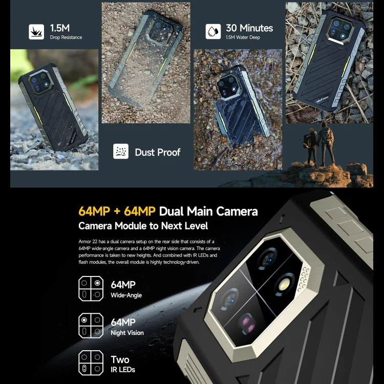 Ulefone Armor 22, IP68/IP69K Rugged Phone, 6.58 inch Android 13 MediaTek Helio G96 Octa Core, Network: 4G, NFC, OTG