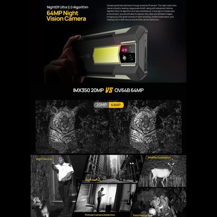 1. Rear Camera: 64MP wide-angle IMX686 sensor FOV 79.8 degree, F1.89 large aperture, 6 piece lens + 64MP night vision camera OV64B sensor FOV 79.8 degree, F1.79 large aperture