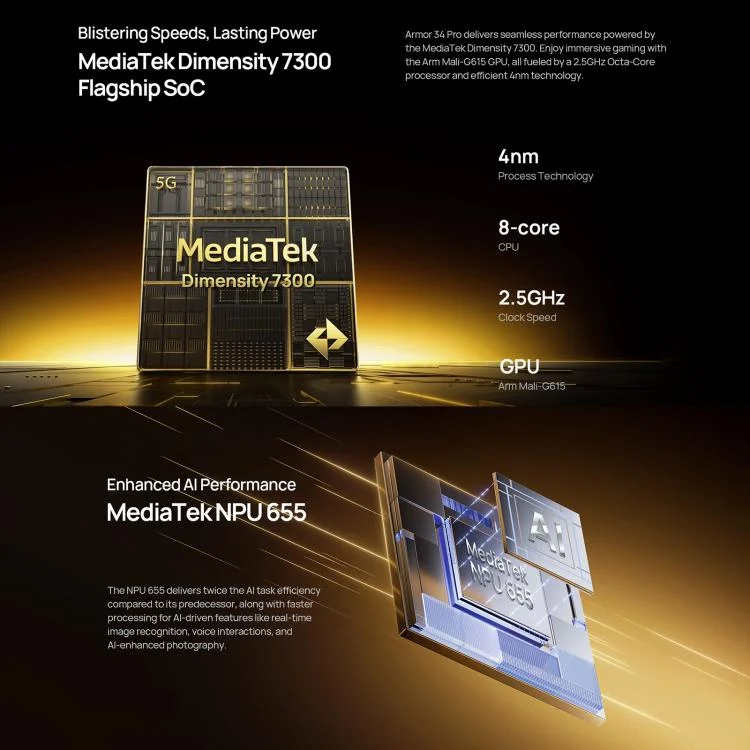 1. CPU: MediaTek Dimensity 7300, octa-core, 4nm, 4x Arm Cortex-A78 up to 2.5GHz + 4x Arm Cortex-A55