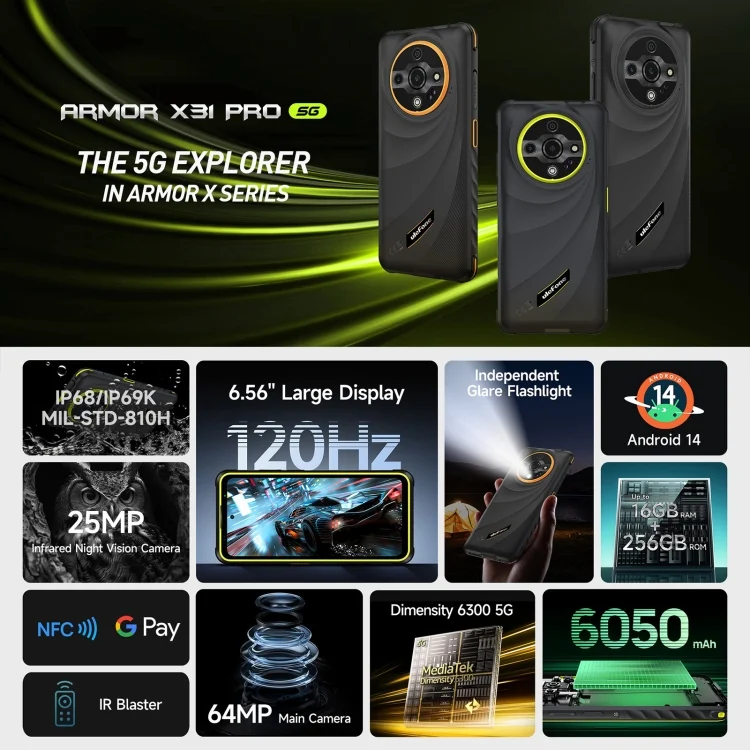 Ulefone Armor X31 Pro 5G, 8GB+256GB, Night Vision, IP68/IP69K Rugged Phone, 6.56 inch Android 14 MediaTek Dimensity 6300 Octa Core, Network: 5G, NFC, OTG