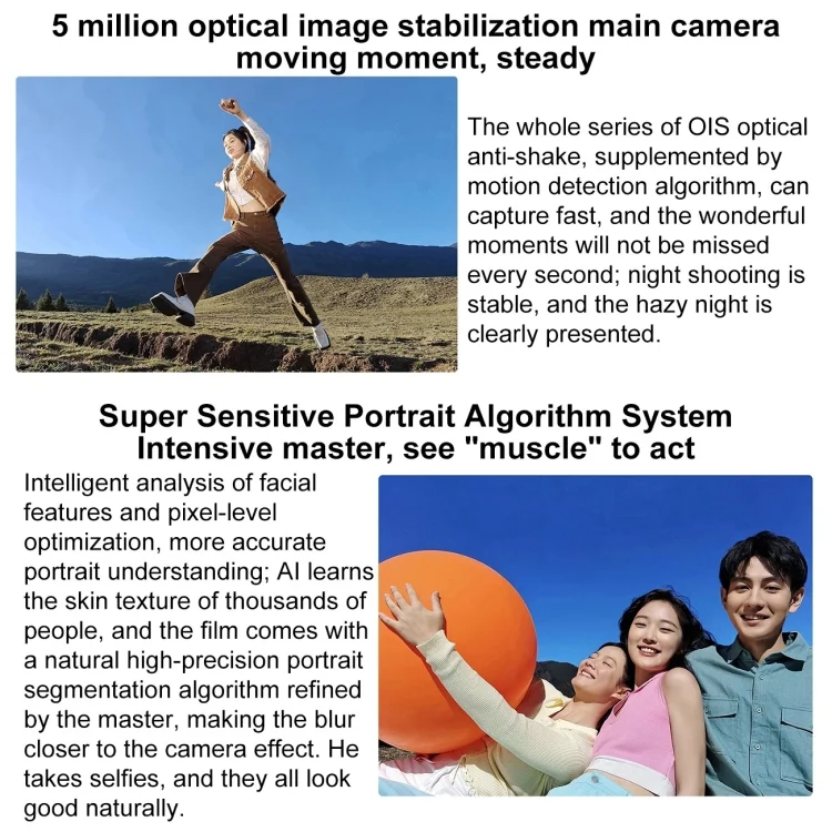 5. Camera function: Front: Night scene, portrait, photo, video, micro movie, dynamic photo, AR cutie; Rear: Night scene, portrait, camera, video, micro movie, 50 million, panorama, dynamic photo, slow motion, time-lapse photography, professional, AR cute shot, smart vision, document correction, sports.