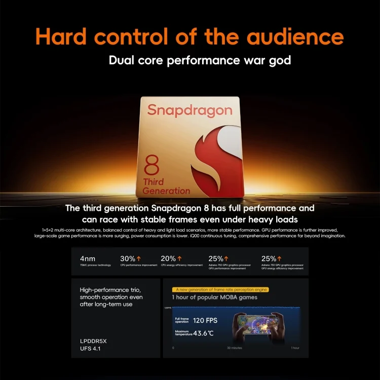 1. CPU: Qualcomm Snapdragon 8 Gen 3, octa-core, 64 bit, 4nm, 3.3GHz x 1 + 3.0GHz x 2 + 3.2GHz x 3 + 2.3GHz x 2