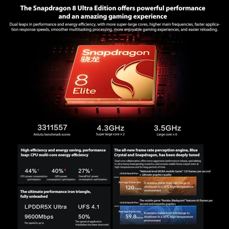 1. CPU: Snapdragon 8 Elite, octa-core, 64 bit, 3nm, 4.32GHz x 2+3.53GHz x 6