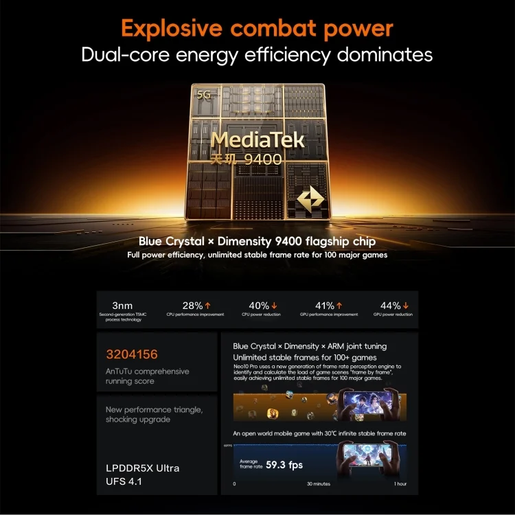 1. CPU: Dimensity 9400, octa-core, 64 bit, 3nm, 3.626GHz x 1 + 3.3GHz x 3+2.4GHz x 4