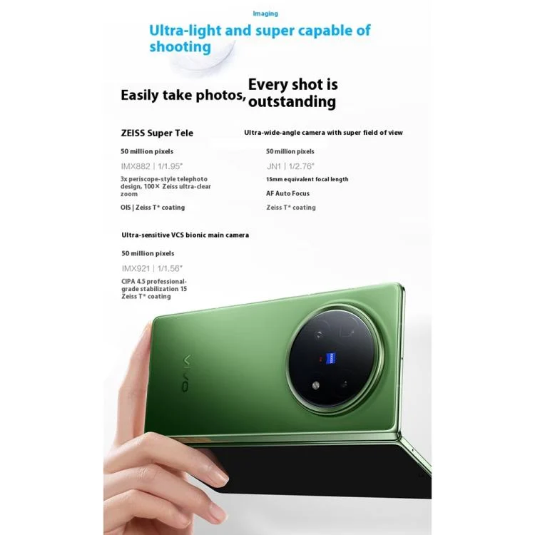 2. Rear: 50MP main f1.57 + 50MP wide-angle f2.05 + 50MP periscope f2.55