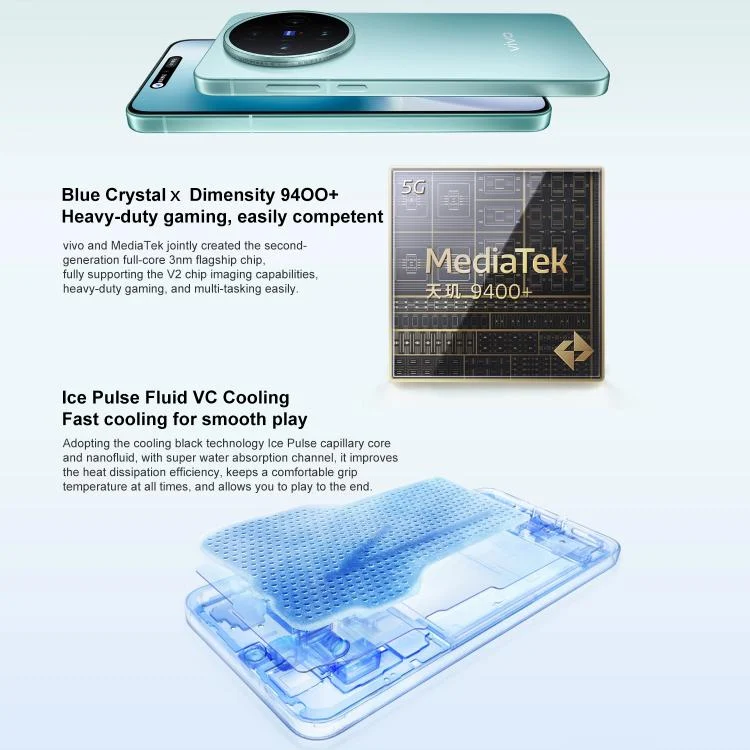 1. CPU: Dimensity 9400+, 64-bit, octa-core, 3nm, 3.73GHz x 1 + 3.3GHz x 3 + 2.4GHz x 4