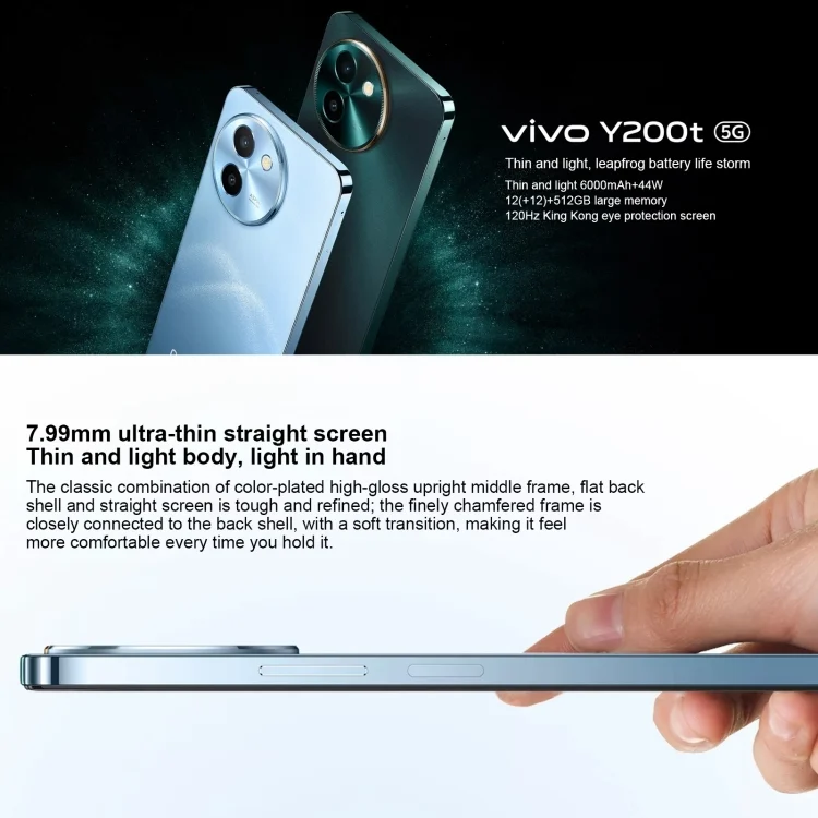 vivo Y200t, Dual Back Cameras, 12GB+256GB, Face ID Screen Fingerprint Identification, 6.72 inch Android 14.0 OriginOS 4 Snapdragon 6 Gen 1 Octa Core 2.2GHz, OTG, Network: 5G, Support Google Play