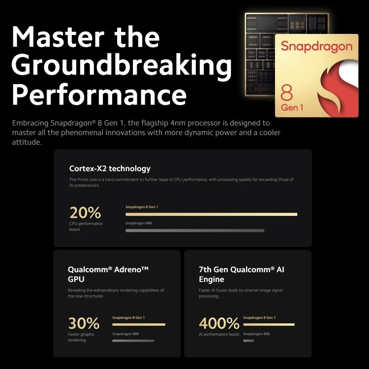 1. Qualcomm Snapdragon 8 Gen1 4nm octa core 1x Prime core (X2-based) 3.0GHz + 3x Gold cores (A710-based) 2.5GHz + 4 x Silver cores (A510-based) 1.8GHz, Combine with 12GB+256GB memory, fast run and smoothly operate.