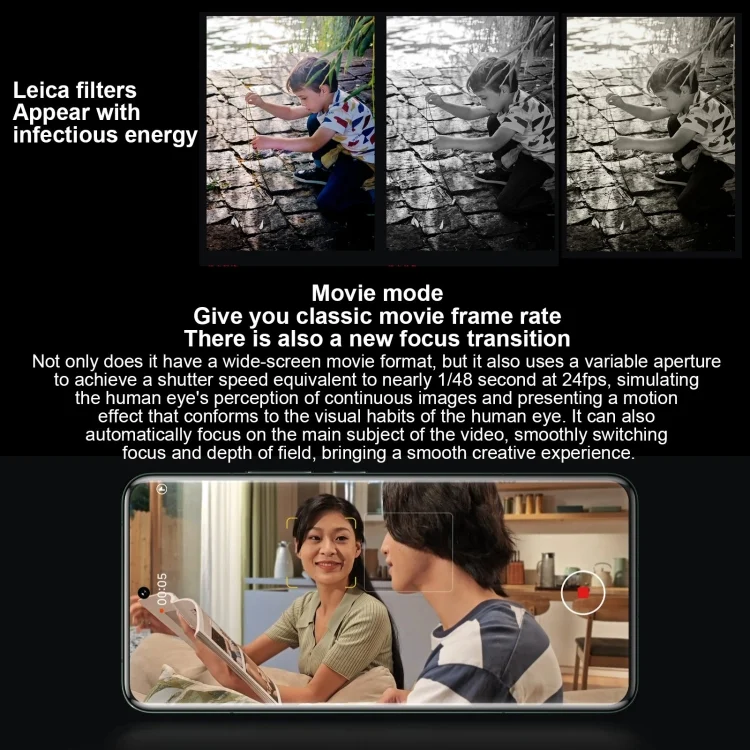 3. Photo functions: Rear: Leica native dual image quality, movie mode, Dolby Vision, master lens package, everything tracking, sound source tracking, radio type, sports capture, short video recording, portrait mode, panorama mode, cute shooting, professional mode, Time-lapse photography, Super Night Scene 2.0, front and rear dual scenes, document mode, VLOG video, super moon, slow motion shooting, AI watermark, long exposure, AI magic kaleidoscope, AI camera, portrait blur adjustment, AI beauty, ultra-wide angle edge Distortion correction, ID photocopying mode, voice subtitles, video filters, video beautification, video super anti-shake, dynamic photos, countdown photo, level meter, timed continuous shooting, face detection, HDR, custom watermark, voice-activated photo; Front: Dolby Vision, short video recording, portrait mode, front and rear dual scenes, time-lapse photography, cute shooting, voice subtitles, video filters, countdown photography, AI smart beauty, portrait blur adjustment, dynamic photos, timed continuous shooting , voice-activated photo taking