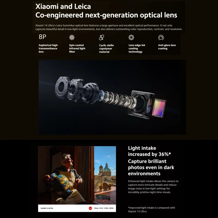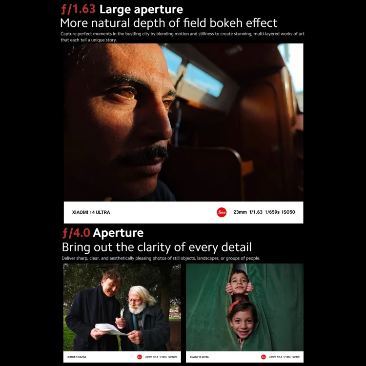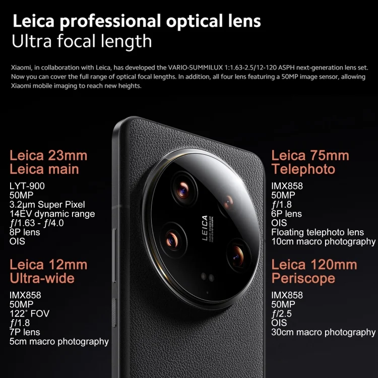 1. Rear camera:50MP 1-inch variable aperture main camera (f/1.63 – f/4.0 stepless variable aperture, equivalent 23mm focal length, supports four-in-one 3.2μm large pixel output, HyperOIS super optical image stabilization, Octa-PD phase focusing, 8P coating) + 50MP Leica floating telephoto (f/1.8 aperture, equivalent 75mm focal length, supports OIS optical image stabilization, 10cm macro) + 50MP Leica close-up telephoto (f/2.5 aperture, equivalent 120mm focal length, supports OIS optical image stabilization) shake, supports Zoom EIS anti-shake, 30cm telephoto macro) + 50MP Leica ultra-low distortion wide-angle (f/1.8 aperture, 12mm equivalent focal length, 122 degree ultra-wide angle, AF autofocus, 5cm super macro)