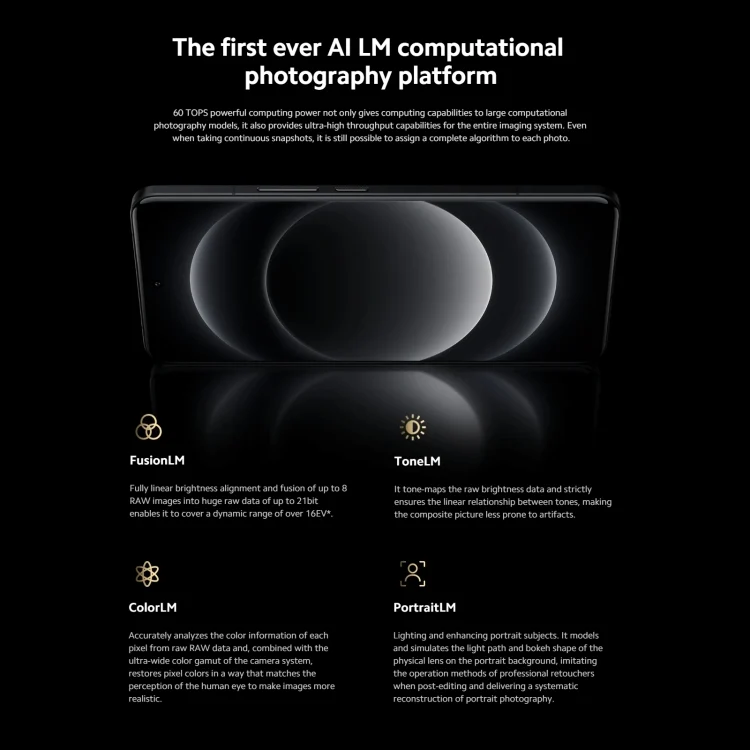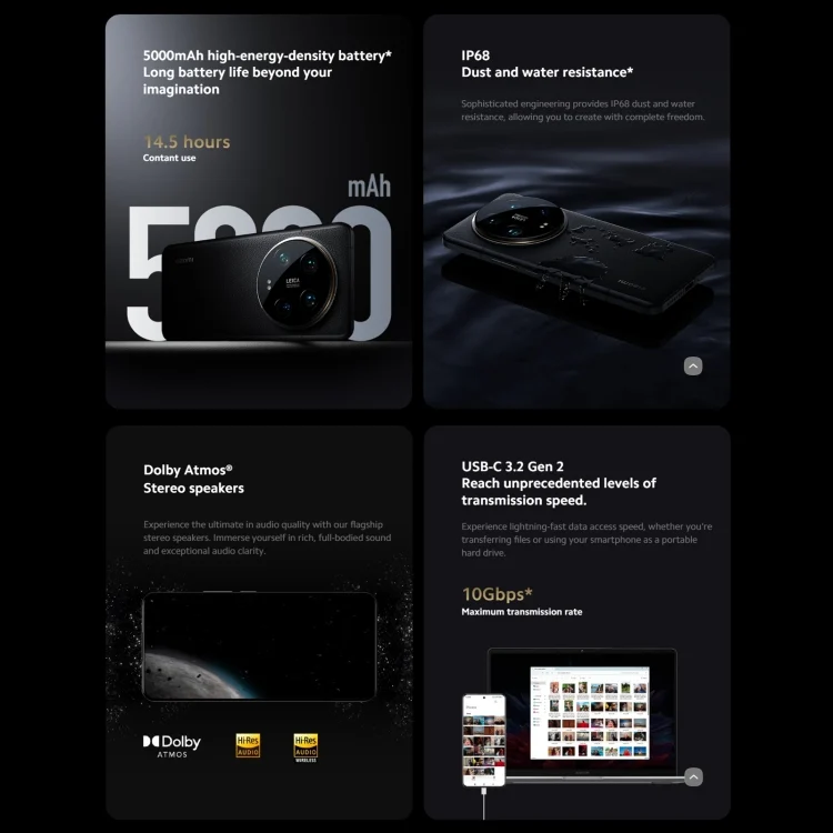 3. Photo functions: Rear: Leica native dual image quality, movie mode, Dolby Vision, Master Portrait, Master Start Shooting, Master LUTs, Everything Focus, Sound Source Tracking, Radio Type, Sports Capture, Ultra RAW, Professional Mode, Document Mode, Super Night Scene 2.0, 50M Ultra-clear, panoramic, short film, slow-motion shooting, time-lapse photography, cute shooting, AI watermark, long exposure, super moon, street photography, director mode, multi-camera shooting, AI camera, portrait blur adjustment, AI beauty , ID photocopying mode, voice subtitles, video beautification, video super anti-shake, dynamic photos, countdown photo taking, level meter, timed continuous shooting, face detection, HDR, voice-activated photo taking; Front: Dolby Vision, short video recording, portrait mode, front and rear dual views, time-lapse photography, cute shooting, voice subtitles, video filters, countdown photography, AI smart beauty, portrait blur adjustment, dynamic photos, timed continuous shooting, voice control Photograph