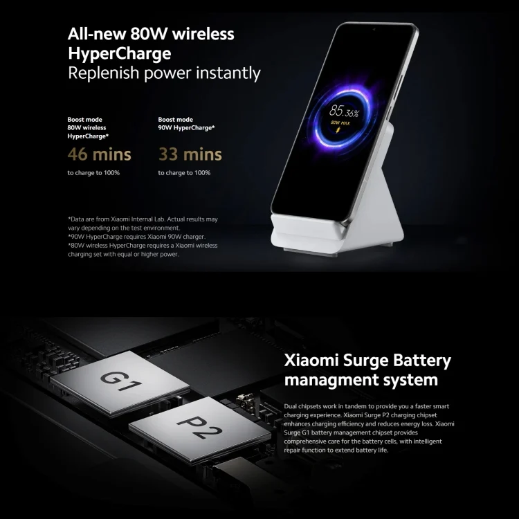 2. Fast charging: Support QC4 / QC3+ / QC3.0 / QC2.0 / PD3.0 / PD2.0 fast charging protocol / MI FC 2.0 fast charging; 90W Xiaomi Hyperwired second charge / 80W Xiaomi Hyper wireless second charge