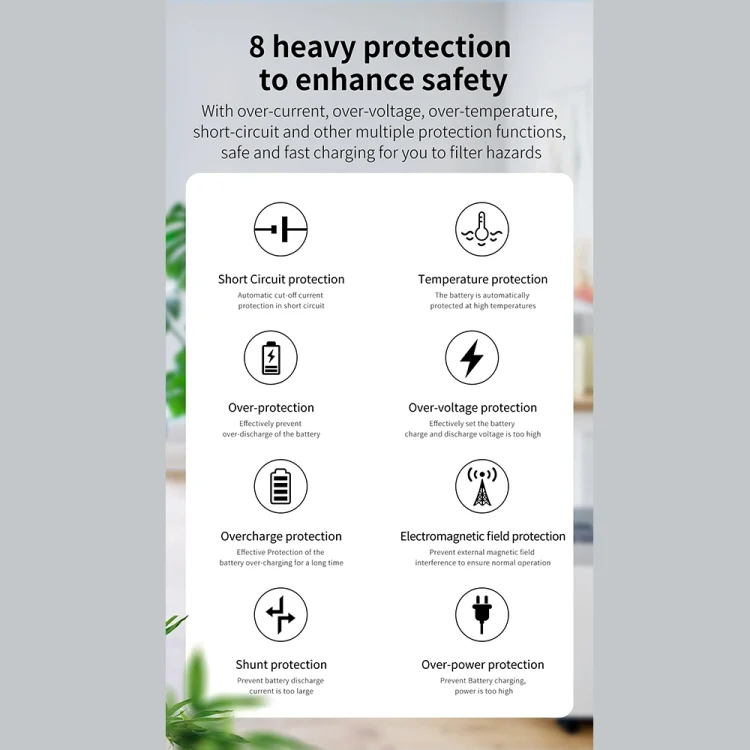5. Safety protection: short circuit protection, temperature protection, over-discharge protection, over-voltage protection, over-charge protection, electromagnetic field protection, shunt protection, over-power protection
