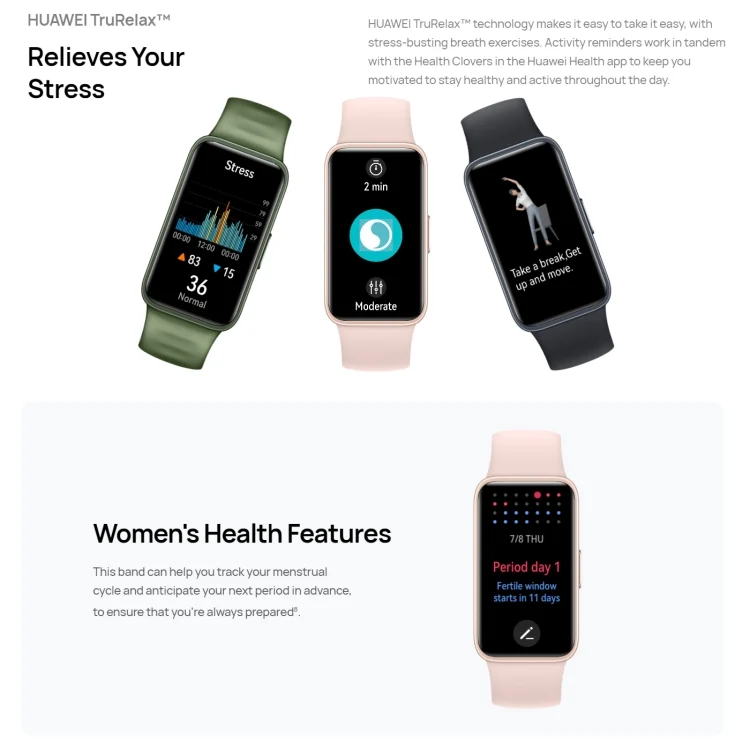6. HUAWEI TruRelax technology makes it easy to take it easy, with stress-busting breath exercises. Activity reminders work in tandem with the Health Clovers in the Huawei Health app to keep you motivated to stay healthy and active throughout the day.