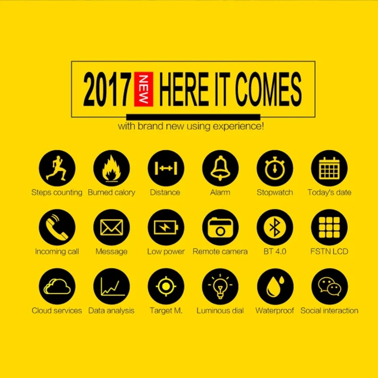 4. Special Features: Pedometer / Alarm / Stopwatch / Notification / Call Notify / Camera Remote Control / Calories Burned.