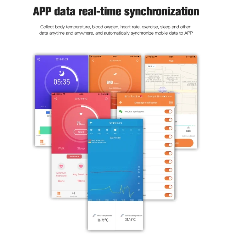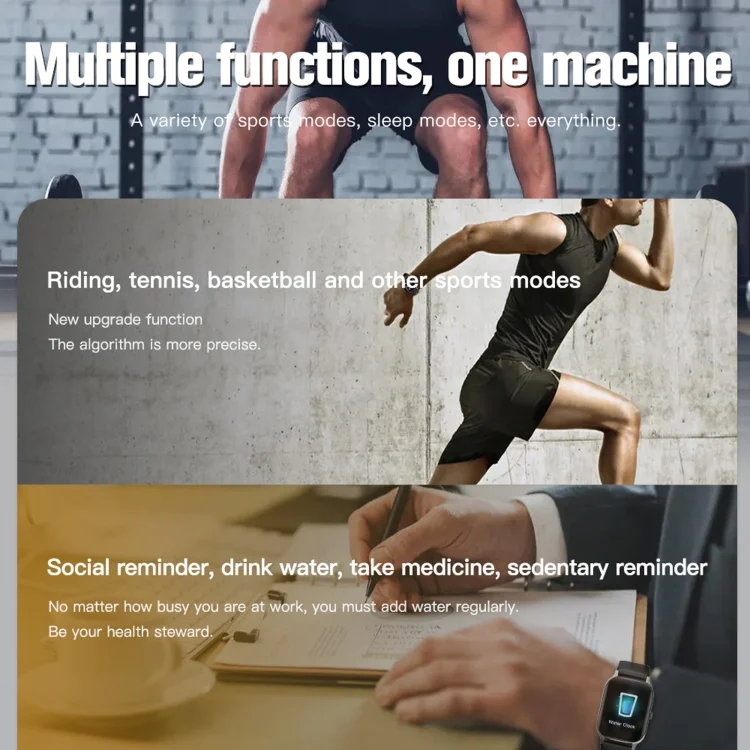 10. Functions: body temperature monitoring, sleep monitoring, heart rate monitoring, blood pressure, blood oxygen, pedometer, distance, calories, stopwatch, multi-sports modes (running, cycling, swimming, mountain climbing), call reminder, information reminder, alarm clock reminder, Sedentary reminder, reminder to drink water, reminder to drink medicine, remote camera, etc.