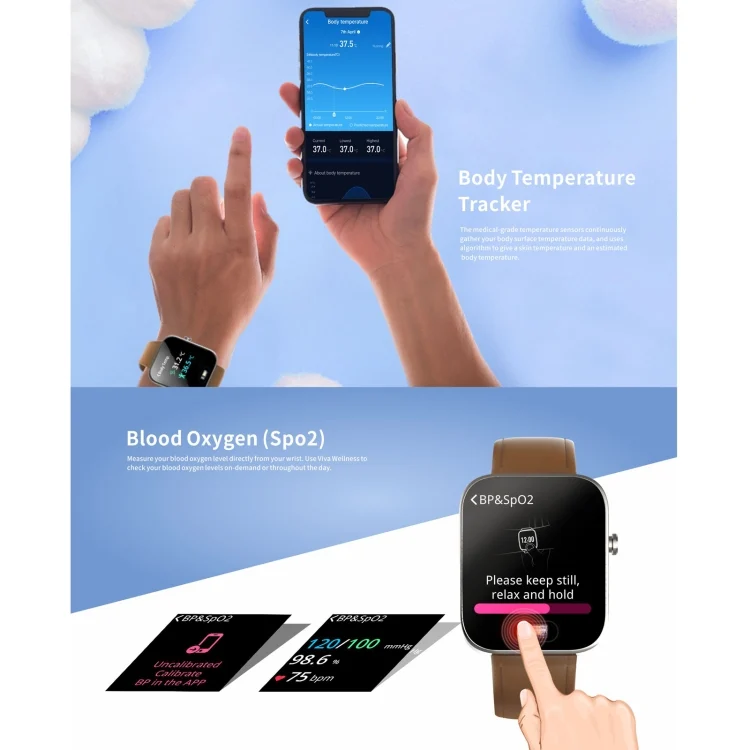 11. Functions: step counting, calories, distance, sedentary reminder, multiple exercise modes, static heart rate, dynamic heart rate, 24-hour heart rate monitoring, heart rate off-hand detection, sleep monitoring, ECG monitoring, blood pressure monitoring, body temperature monitoring, messages Push, message storage, time/date display, custom dial, etc.
