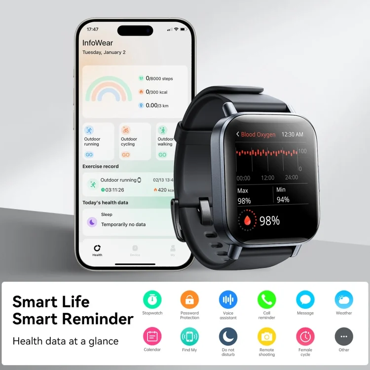 1. 1.96 inch HD TFT display, ultra-high clarity and responsiveness, multiple watch faces with different styles