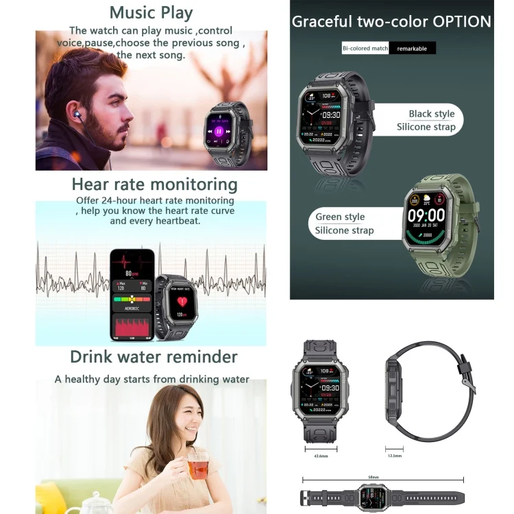 – Call function, voice assistant. Heart rate monitoring, blood pressure monitoring, blood oxygen monitoring, sleep monitoring (sleep time, sleep quality)