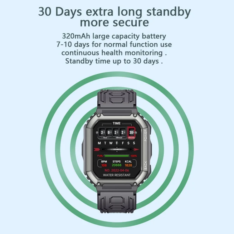 – Time and date display, step counting, calories, distance, stopwatch, countdown