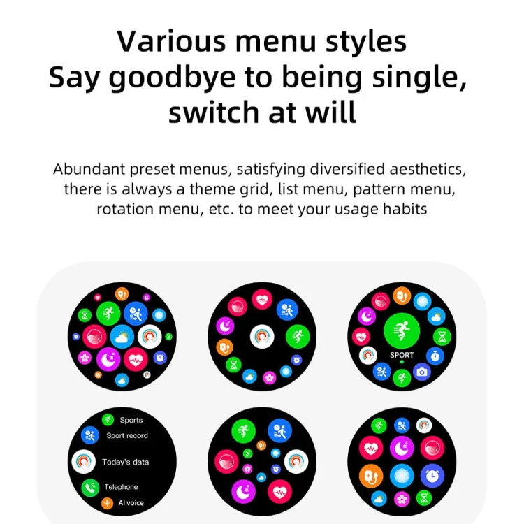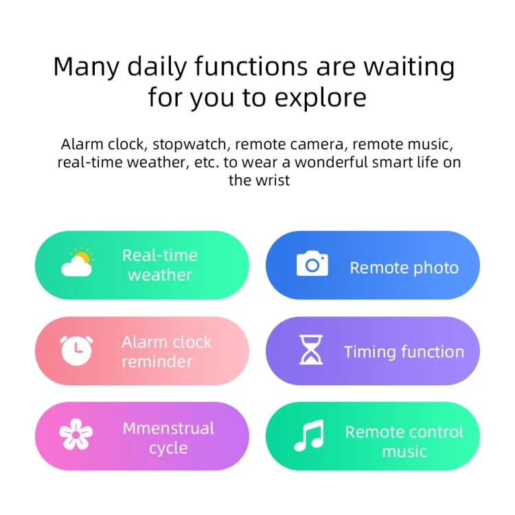 14. Product functions: Bluetooth calls, 6 sets of themes, female physiological cycle, custom dial, step counting, brightness adjustment, multi-sports mode, sleep detection, heart rate, blood pressure, breathing training, information push, remote music, remote photography, real-time weather, find mobile phone (connect to mobile phone for use), alarm clock, stopwatch, do not disturb mode, call reminder