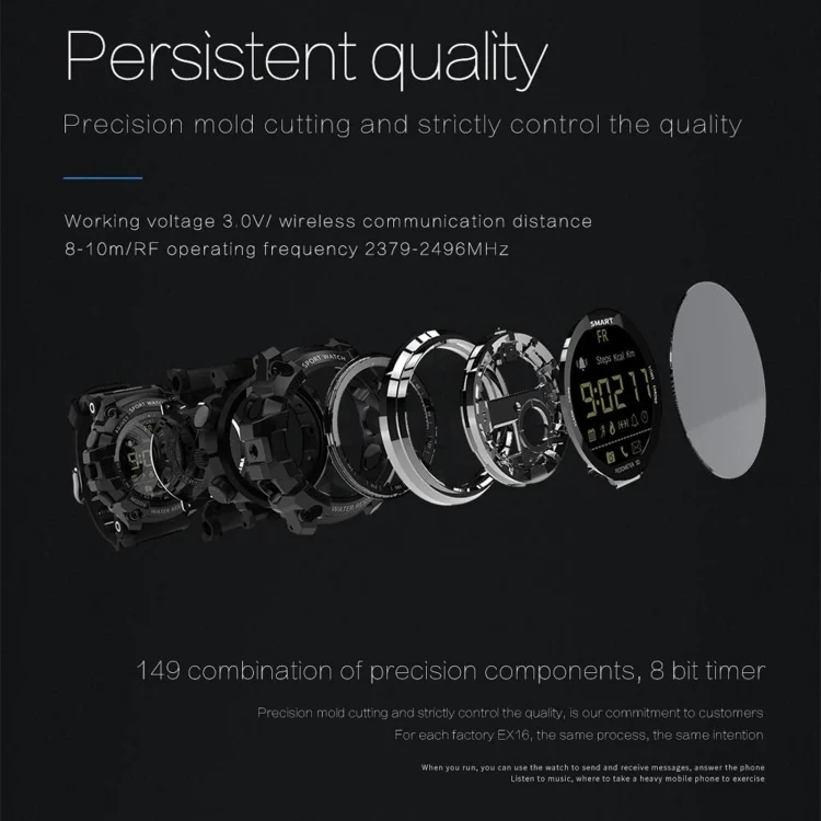 7. Function: exercise record (pedometer, calorie burn, mileage,). The watchs exercise data is stored for 15 days (recurring coverage), and information pushes: push notifications for incoming calls, QQ, WeChat, SMS, Facebook Twitter, etc. (The phone or information sign on the dial flashes) Alarm clock, stopwatch, remote camera, etc.