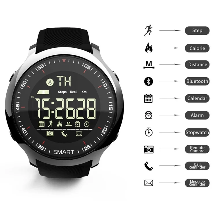 9. Function: exercise record (pedometer, calorie burn, mileage,). The watchs exercise data is stored for 15 days (recurring coverage), and information push: push notifications such as incoming calls, QQ, WeChat, SMS, Facebook Twitter, etc. (The phone or information sign on the dial flashes) Alarm clock, stopwatch, remote camera, etc.