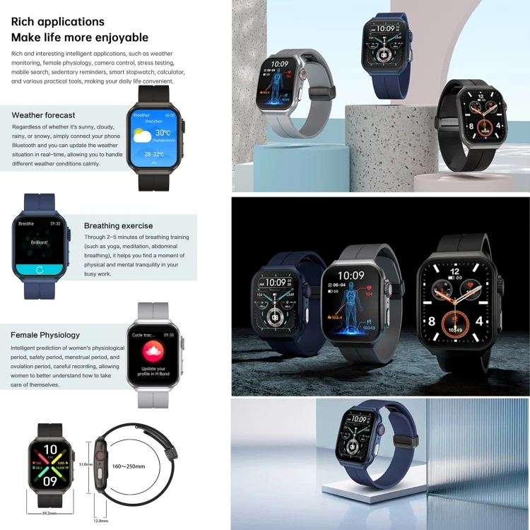 2. Function: BT calling, Ecg detection, Heart rate detection, Blood oxygen test, blood pressure detection; Time, Pedometer, Calorie, Consumption, Distance Calculation Multiple sport modes; Sleep detection (Sleep time , Sleep quality; Calls to remind,SMS Reminder,Third-party messaging reminder: Multilingual push; Task Reminder (Sedentary reminder), Music control