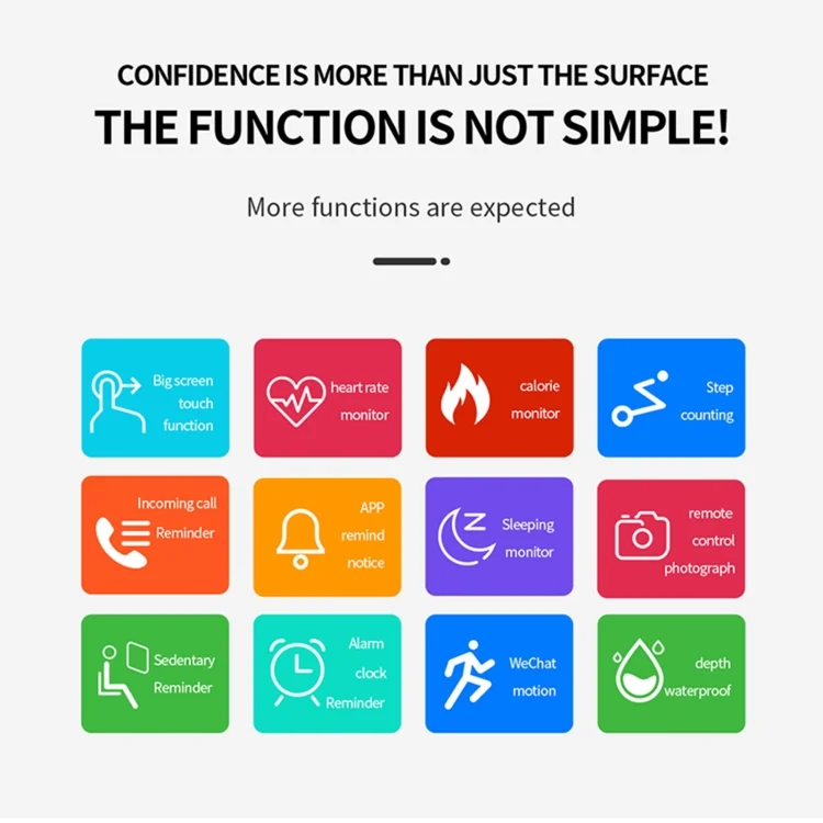 14. Functions: step counting, sleep monitoring, alarm clock, multiple sports modes (walking, running, cycling, skipping rope, swimming, badminton, football, etc.), sedentary reminder, incoming call/information reminder, notification push, heart rate monitoring, blood pressure detection, blood oxygen detection, remote camera, music control, etc.