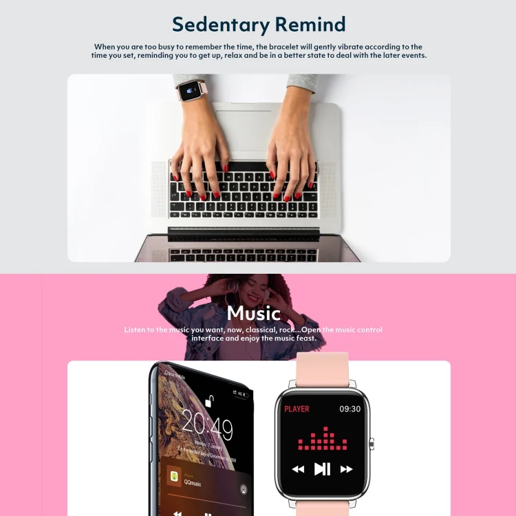 18. Functions: blood pressure monitoring, sleep monitoring, blood pressure and oxygen monitoring, step count calculation, exercise distance, calorie consumption, raising hand to brighten the screen, alarm clock reminder, call reminder, SMS reminder, message notification, sedentary reminder, stopwatch, music control , control the camera, the weather, etc.