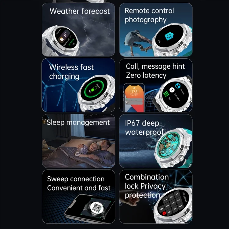 14. APP functions: camera, power off, standby dial, password; mobile music, weather, dial, message, brightness adjustment; calendar, alarm clock, blood oxygen, pressure, game (the early bird catches the worm), restart; language, call (contact, call record, dial), step count, exercise (running, indoor, walking, cycling, mountaineering, yoga, cricket, basketball, football, badminton, golf, skipping, Tai Chi, table tennis, volleyball, baseball, tennis, hockey), heart rate, exercise record, women’s health; blood sugar, calculator, blood pressure, sleep, stopwatch, contact; Do not disturb, search, settings (adjust brightness, password, Do not disturb mode, language switch, theme switch, system menu, standby dial, raise your hand to light up the screen, always on, time setting, date setting, about), breathing, countdown; factory reset, about, voice assistant, drainage; lower menu: time and date, power, weather, Bluetooth, always on setting, alarm clock, brightness adjustment, QR code, settings, Do not disturb; upper menu: information; Swipe right: heart rate, activity, stress, blood oxygen, (click “+” to add sleep, music, weather, call menu, breathing training, language assistant, etc.); swipe left: display the content added by swiping right;