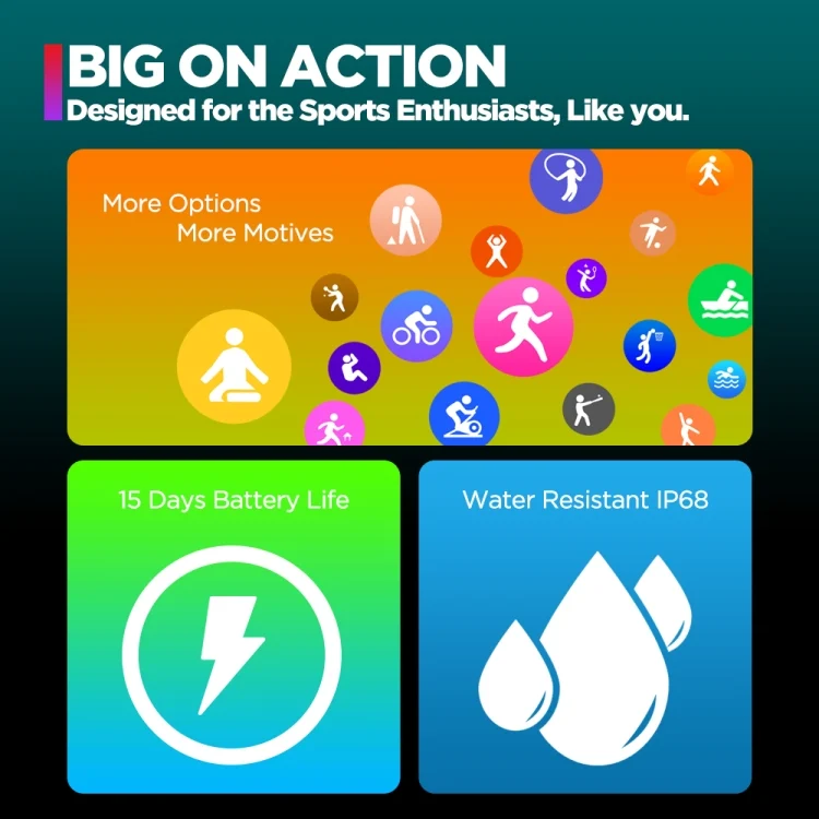 6. Sport Modes: Outdoor Running, Cycling, Jumping Jack, Skipping, Badminton, Table Tennis, Tennis, Alpinism, Walking, Basketball, Football, Baseball, Cricket, Volleyball, Hockey, Rugby, Dancing, Yoga, Spinning Bike, Sit-ups, Indoor Running, Boating, Gymnastics, Swimming.