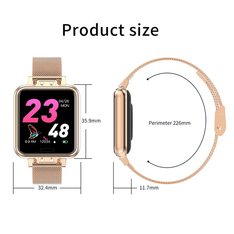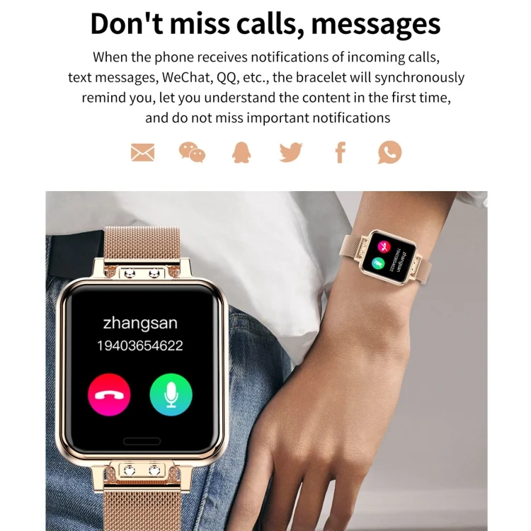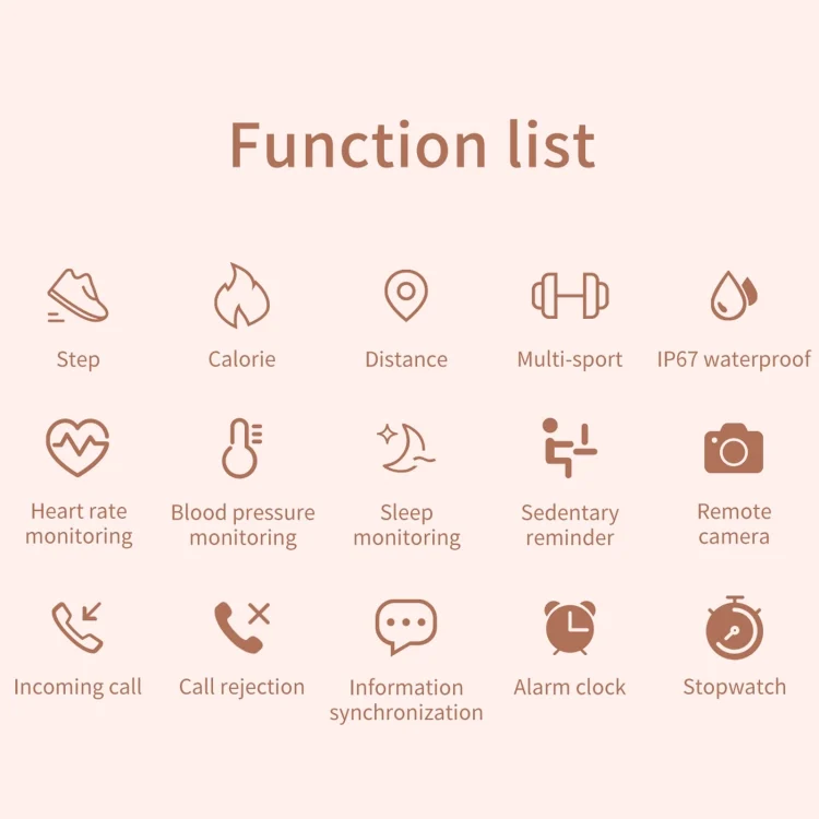 9. Function: call reminder push, SMS reminder push, WeChat reminder push, QQ reminder push, exercise record (step counting, mileage, etc.), sleep monitoring, heart rate detection, blood pressure detection, exercise mode, remote photo, sedentary reminder, search Mobile phone, menstrual cycle reminder, etc.
